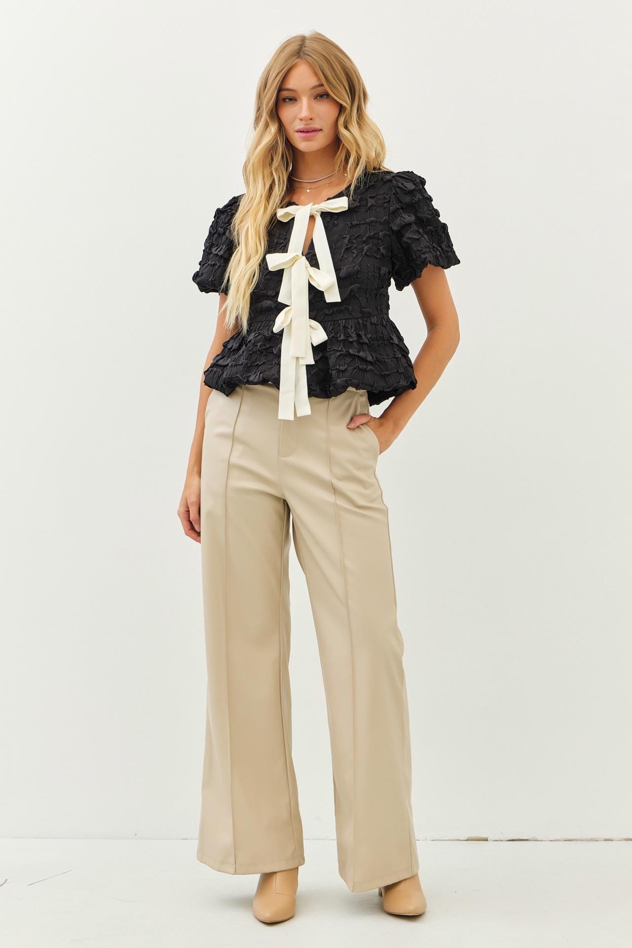 Elevate your wardrobe with our most loved blouse—a true best seller since last year. Designed for effortlessly romantic moments, this textured babydoll-style top features playful bubble sleeves, a flattering silhouette, and an eye-catching contrast bow tie front. Whether you’re dressing up for a wedding, graduation, or a special date, this top makes you feel feminine, confident, and unforgettable.